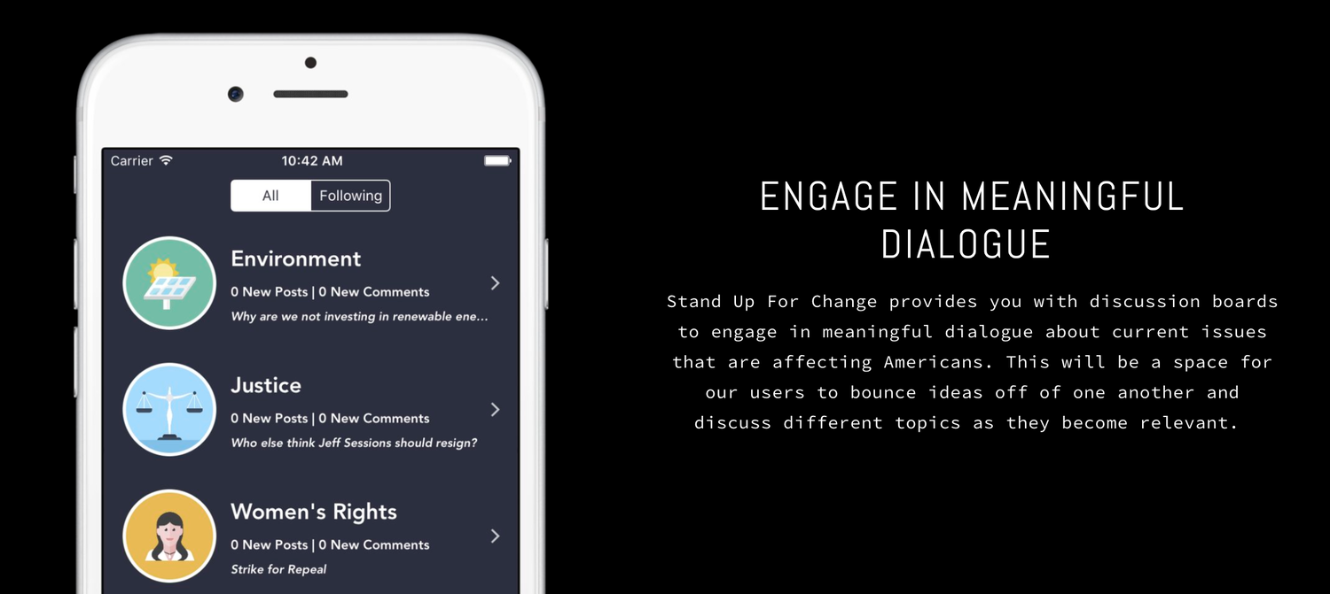 Stand Up For Change empowered users to complete Call-To-Actions (like calling senators, tweeting representatives, signing petitions), organizing and attending events, and discussing pressing issues with others. Stand Up For Change is no longer available in the App Store.